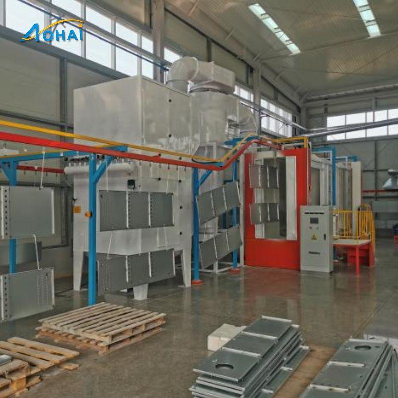 A powder coating line is a complete system used in industrial manufacturing to apply dry powder coatings onto workpieces through a series of interconnected stages. provide a controlled and efficient process, with each stage being optimized to ensure high-quality coatings are achieved consistently. The powder coating system offers many advantages over traditional liquid coating methods, including reduced waste, increased efficiency, and improved environmental impact. Powder coating lines are commonly used in various industries, such as automotive, aerospace, and construction, to coat a variety of materials, including metal, plastic, and wood, etc. Automatic powder coating line system including pre-treatment--drying oven--cooling zone--automatic powder coating booth--curing oven -- cooling zone and fully automatic conveying system, designed and installed by Aohai.