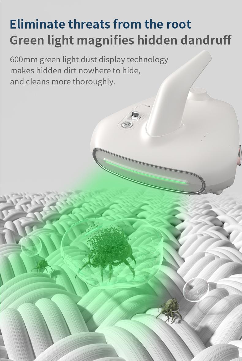 1. Working mode: Switch gears 1-2, UV sterilization and mite removal. 2. Air duct technology: Turbo air duct suction, powerful mite removal. 3. Wireless design: free from the constraints of power cords, more convenient to use. 4. Low energy consumption: 40-50 minutes of battery life, significant energy savings. 5. Large capacity dust box design: 550mL hidden dust box, avoiding secondary pollution, saving worry and effort. 6. Effect: You can use your phone, green beans, and rice to clean them all at once.